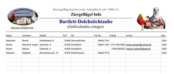 Suche nach Züchtern von Bartlett-Dolchstichtauben. Auf der Startseite unter