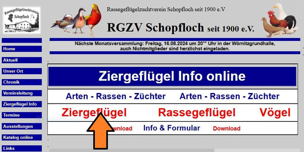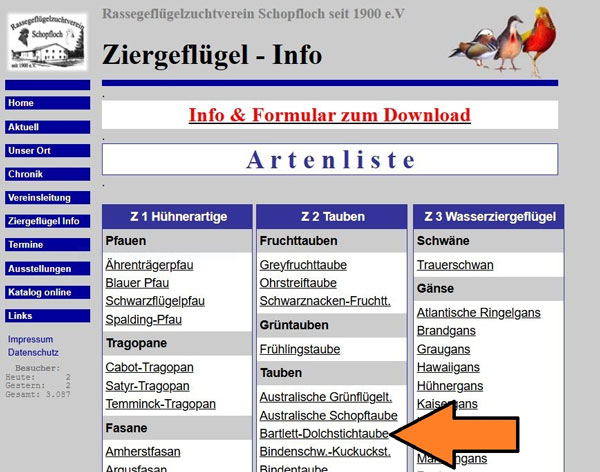 hier den Link Ziergeflügel anklicken. Die Seite Artenliste erscheint. Hier